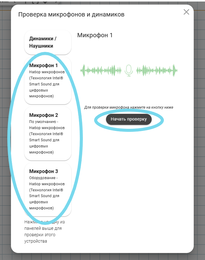 В меню иконки микрофона выберите пункт «Проверить микрофоны и динамики». На экране появится окно теста со списком устройств приема и передачи звука.