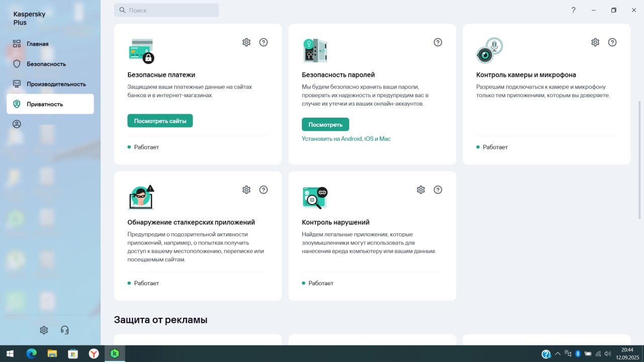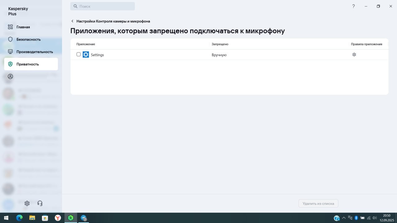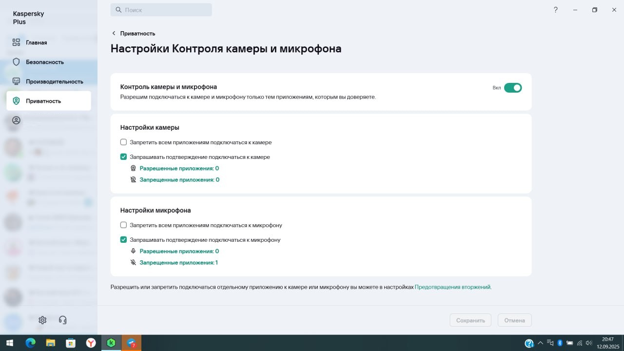 В особо редких случаях доступ к камере и микрофону может блокироваться Касперским или другим антивирусом. В этом случае надо снять запреты в приложении антивируса. Например в Касперском это выглядит так:
