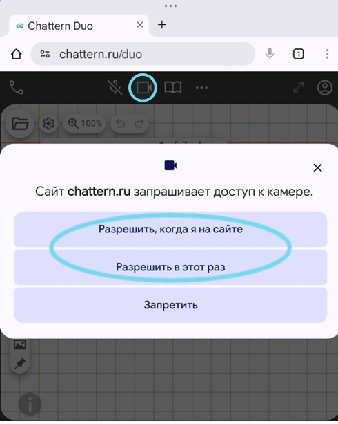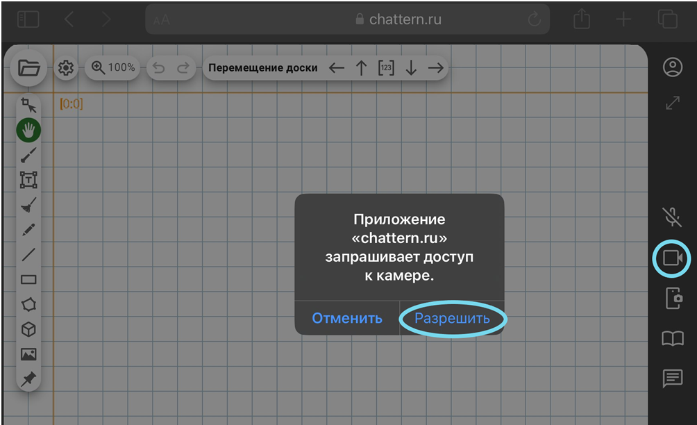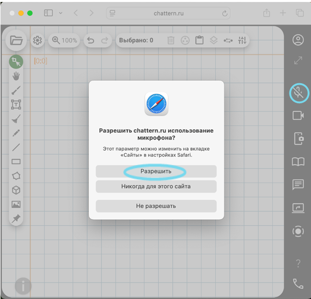 На устройствах Apple с браузером Safari при включении микрофона/видеокамеры также появится диалоговое окно о том, что сайт chattern.ru запрашивает разрешение на использование микрофона/видеокамеры. Необходимо выбрать «Разрешить». Если все сделано верно, то значок микрофона/видеокамера станет зелёным.