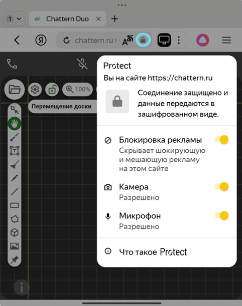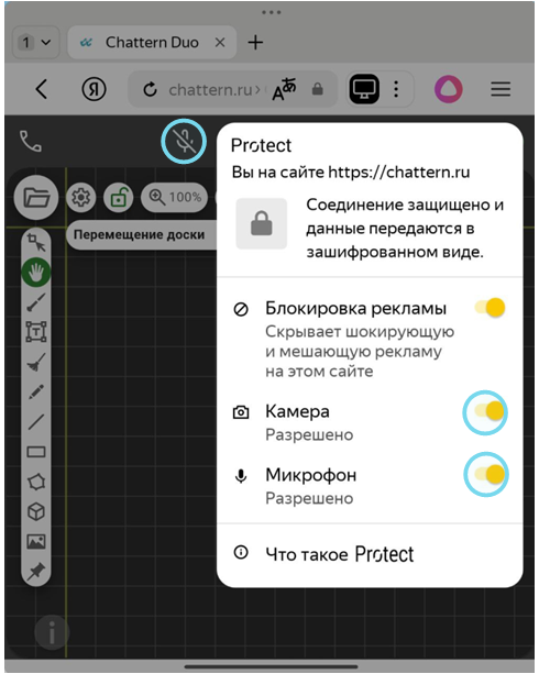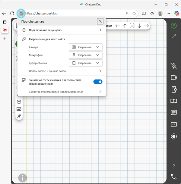 Чтобы исправить ошибку, нажмите на значок замка или настроек в адресной строке рядом с адресом chattern.ru. Проверьте, даны ли разрешения на использование микрофона и камеры. Если нет — включите их.