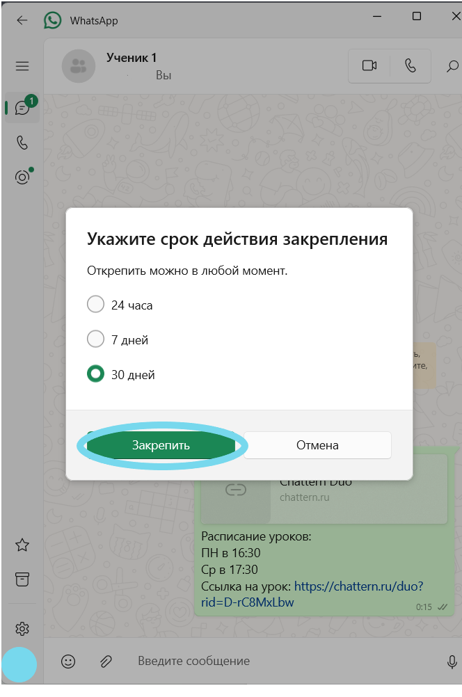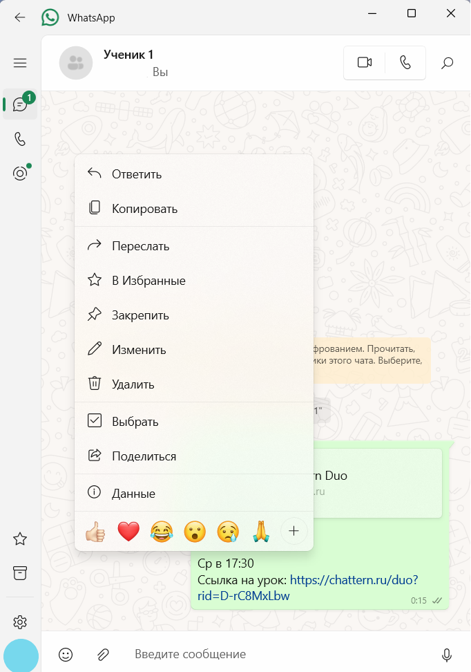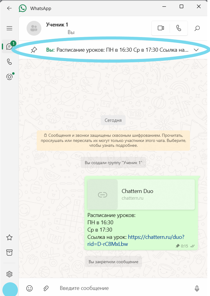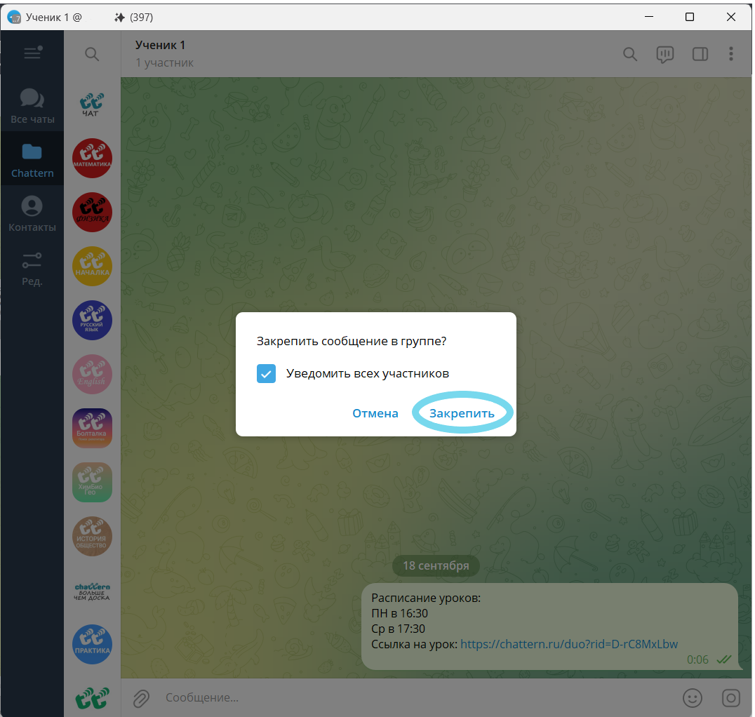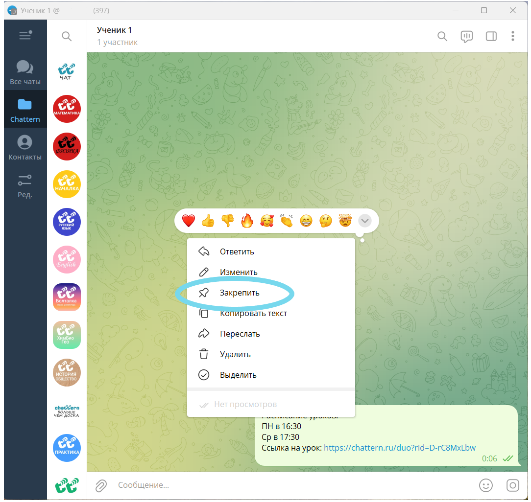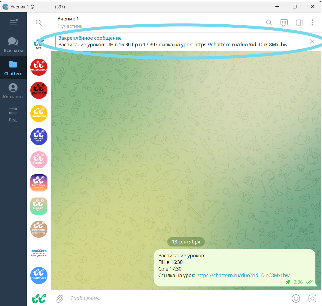 Если у вас есть рабочий чат с учеником, отправьте ему ссылку и закрепите её вверху переписки (например, в Telegram или WhatsApp). Тогда ссылка всегда будет легко доступна и не затеряется среди сообщений.
