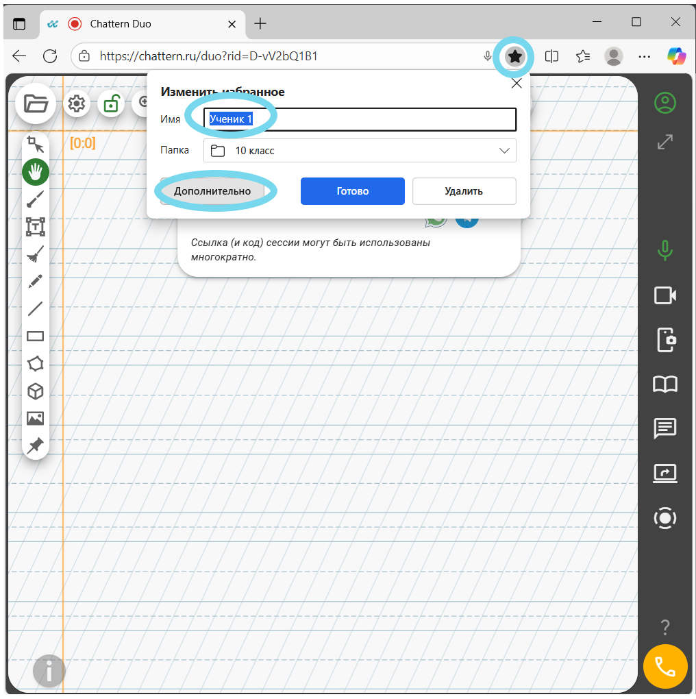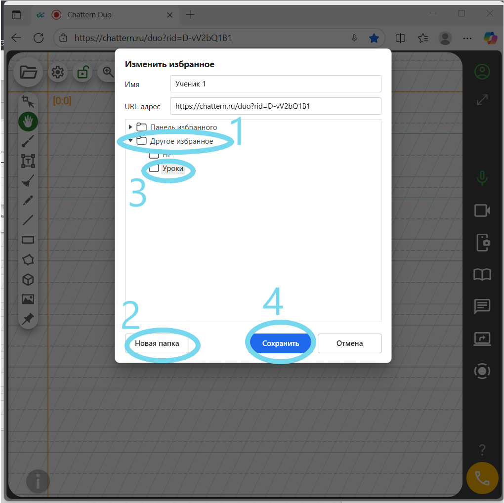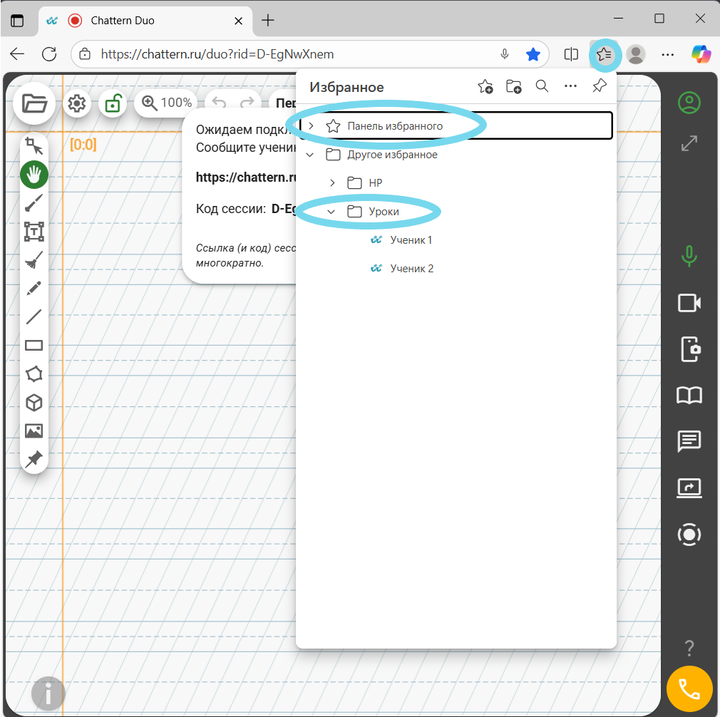 В любом браузере можно создать отдельную папку для закладок, например, с названием «Chattern». Добавляйте в эту папку закладки со ссылками на сессии и называйте каждую закладку именем ученика. Это позволит быстро открывать нужную ссылку без долгого поиска. Помимо создания папок, в некоторых браузерах можно добавлять теги к закладкам (например, в Firefox), что облегчает поиск и классификацию ссылок.
