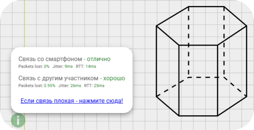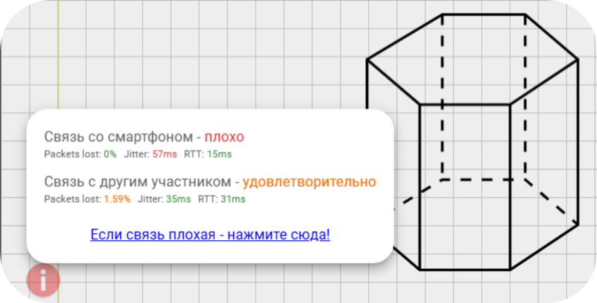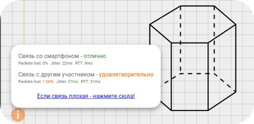 2. Круглая кнопка i в левом нижнем углу доски показывает качество соединения между двумя участниками, а так же между вашим локальным компьютером и смартфоном, если он используется как Тетрадная камера. Кликнув на кнопку i, вы можете получить детальную информацию по двум вышеперечисленным параметрам.