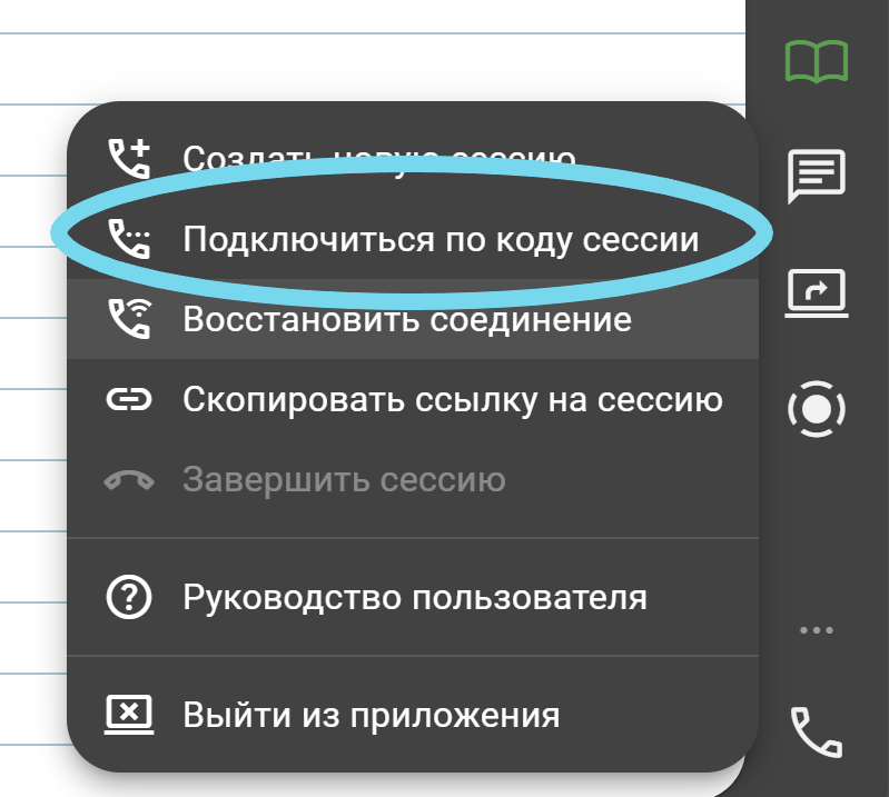 Чтобы создать новую сессию, нажмите на иконку телефонной трубки на главной панели управления и затем выберите меню «Создать новую сессию».