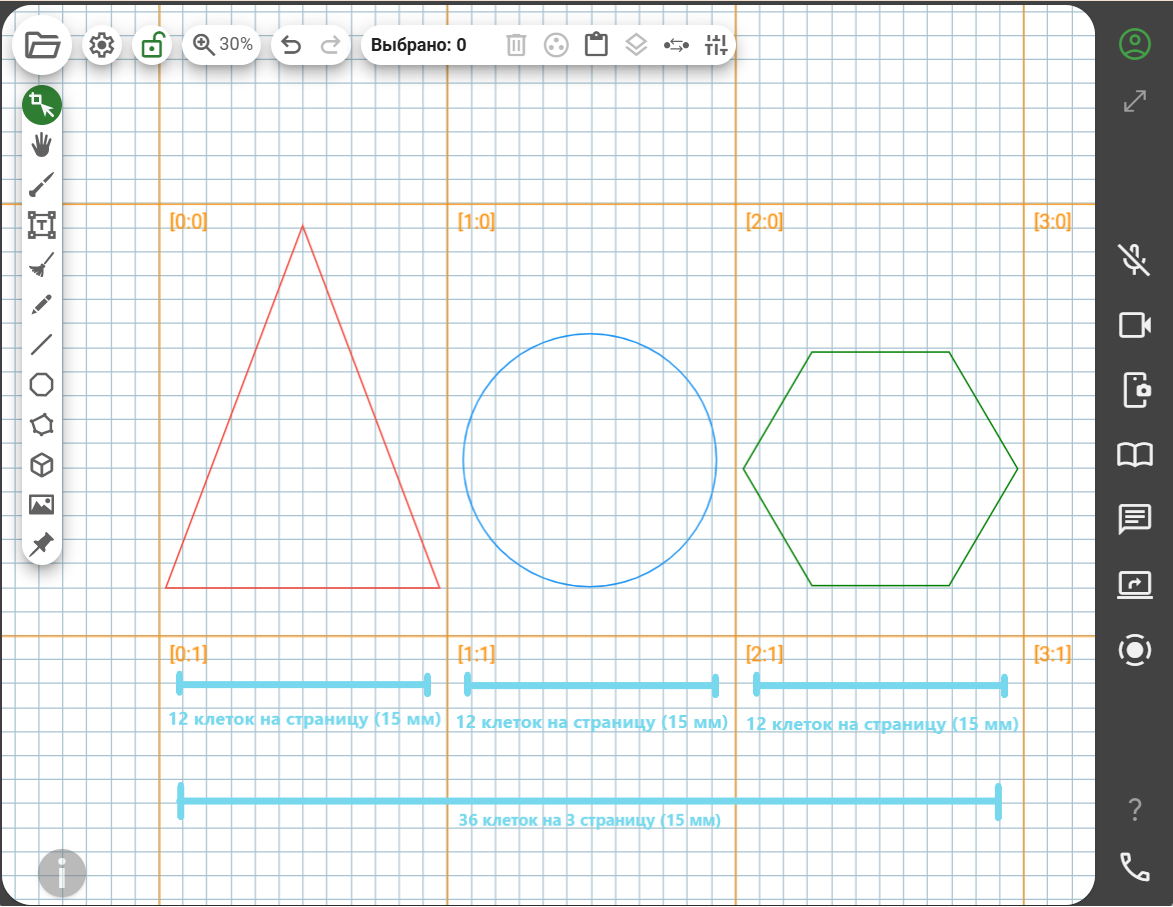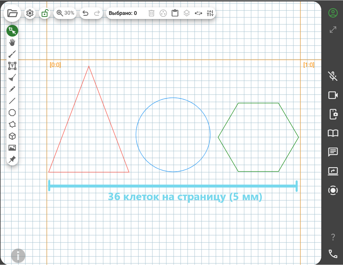 Параметр «Размер средней клетки на PDF странице» регулирует масштабирование доски при распечатке на принтере или сохранении в файл PDF. Чем меньше значение этого параметра, тем мельче окажутся объекты доски на бумаге, и большее их количество поместится на PDF странице. Например, если выбрать разметку доски «Средняя клетка», а параметр «Размер средней клетки» установить 5мм, то при экспорте в PDF вертикальной страницы ее ширина составит 36 клеток. А, соответственно, при ширине клетки в 15мм на PDF страницу поместится только 12 клеток. Размер 5мм соответствует размеру клетки в классической ученической тетради.