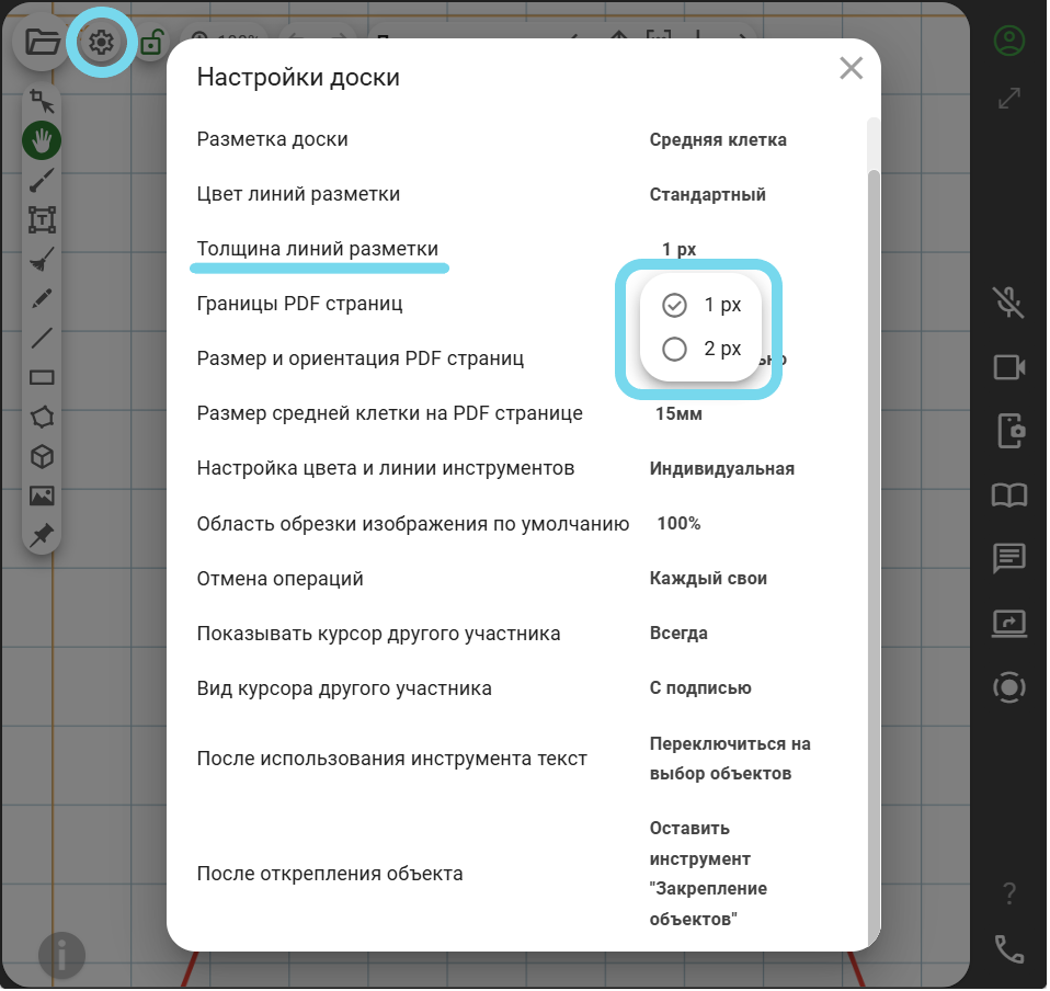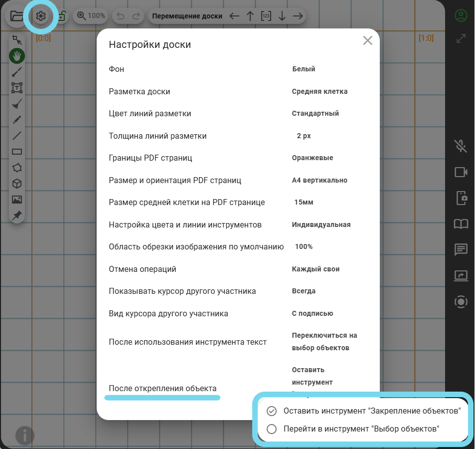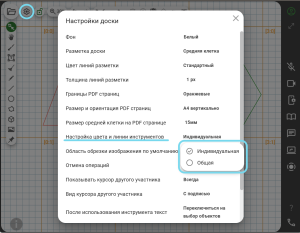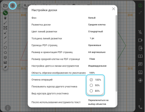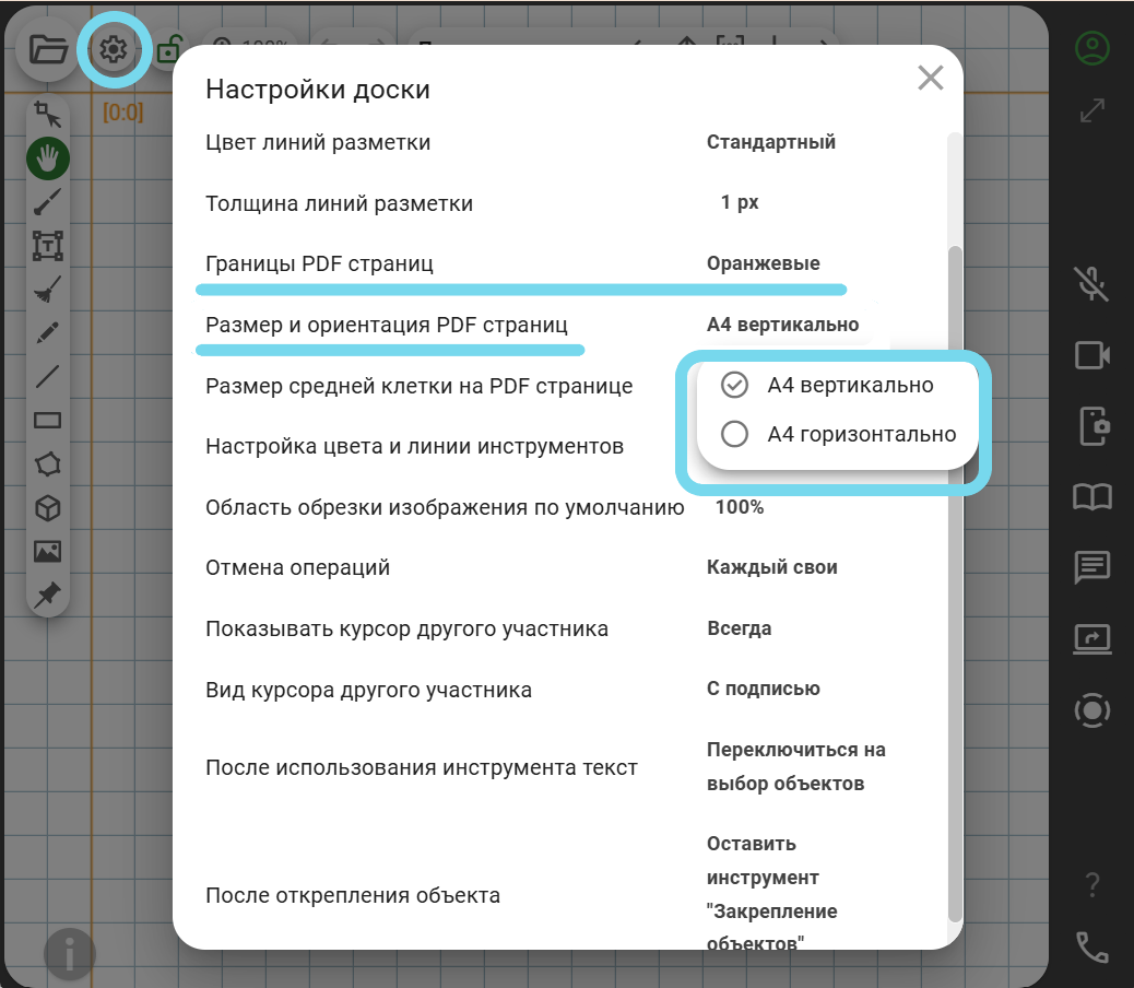 Параметр «Размер и ориентация PDF страниц» также относится к экспорту доски в PDF. На данном этапе PDF файл сохраняется только с размером бумаги А4, но пользователь может выбрать горизонтальную или вертикальную ориентацию страниц.