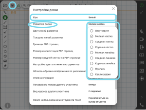 Для экспорта доски в PDF формат, она должны быть разбита на страницы. Пользователь может выбрать, нужно ли ему отображение границ страницы на доске. Если отображение не требуется, надо выбрать пункт «Отсутствуют» в настройке доски, которая называется «Границы PDF страниц«.