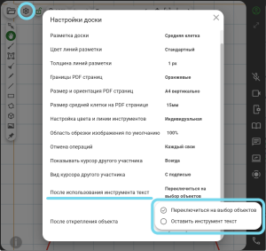 Пользователь может выбрать, что произойдет после едино кратного использования инструмента «Текст». Если установить этот параметр на «Переключиться на выбор объектов», то после каждой вставки объекта «Текст» система автоматически будет переходить в режим выбора объектов (первая кнопка на вертикальной панели доски).