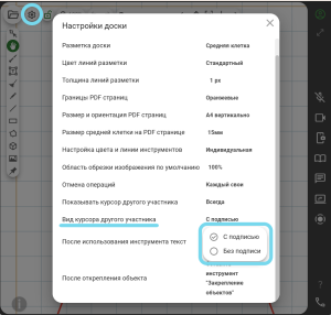 Пользователь может выбрать, как у него будет отображаться курсор другого участника с подписью или без.