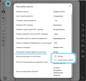 Пользователь может выбрать, показывать ли курсор второму участнику сессии всегда, или только когда он пишет, рисует.