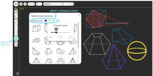 Для вызова библиотеки необходимо нажать на кнопку с кубом на вертикальной панели и выбрать необходимую фигуру из представленных в библиотеке. Для выбранной фигуры можно задать цвет и толщину линии.