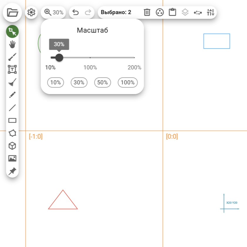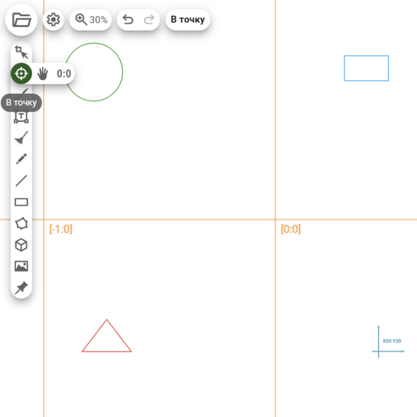 Под иконкой «Рука» находятся три инструмента, относящиеся к инструментам навигации по доске: «Перемещение доски» («Рука»), «В точку» («Прицел») и «Выбор начала доски» («0:0»)