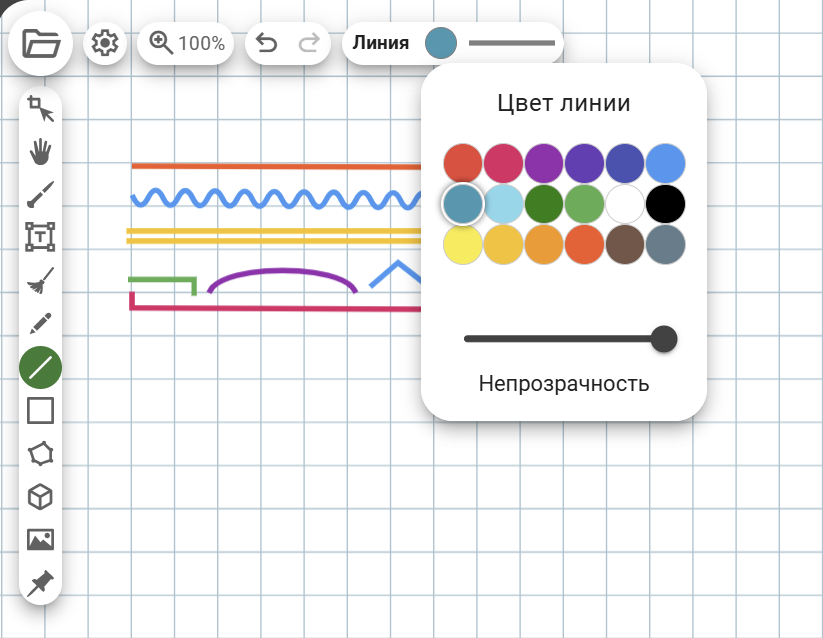 Под иконкой «Линия» находится сам инструмент «Линия», а также «Вектор», «Система координат» и инструменты для филологов: «Двойная линия», «Волнистая линия», «Приставка», «Корень», «Суффикс» и «Квадратная скобка» (основание).