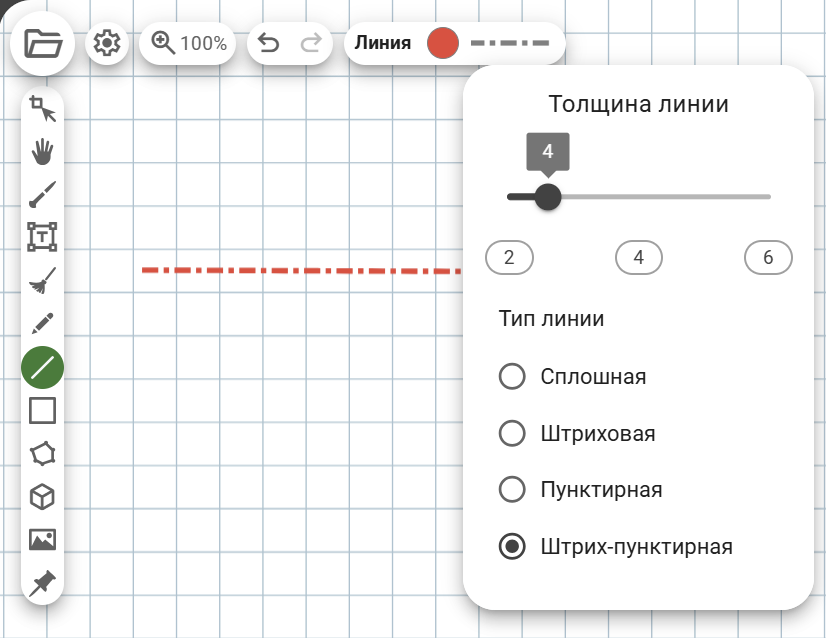 У одиночной и двойной линии помимо цвета и толщины можно изменить параметр «Тип линии». Например, если вам надо подчеркнуть пунктиром с точкой обстоятельство как член предложения, выберите инструмент «Линия» и измените её тип на «Штрих-пунктирная».