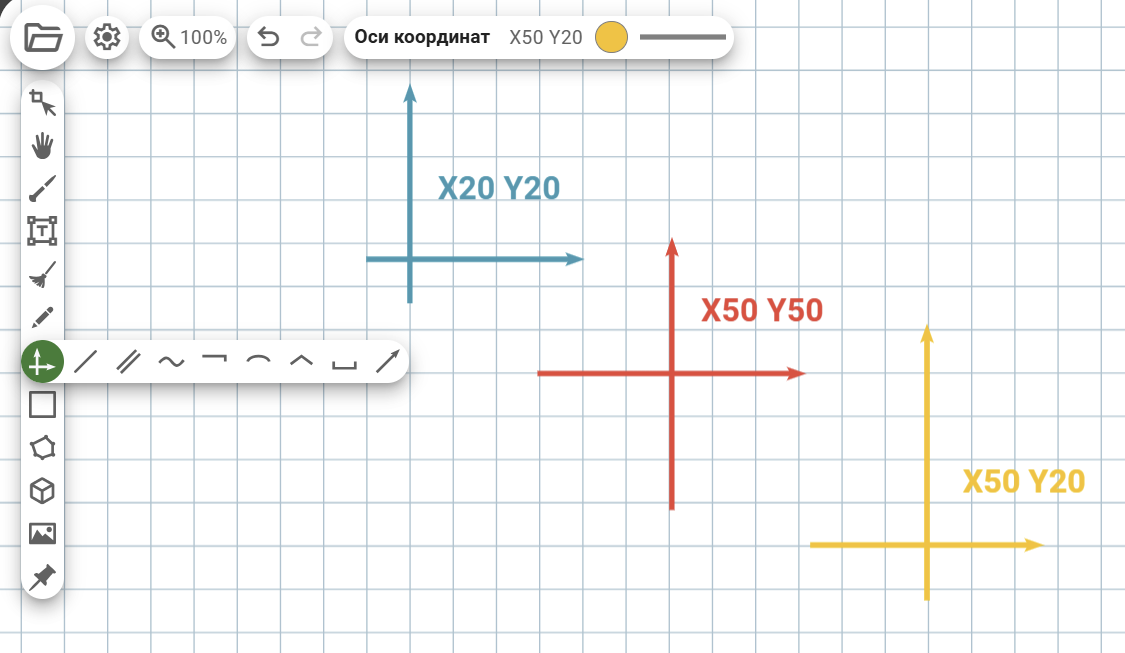 При настройке системы координат помимо цвета и толщины линии можно выбрать смещение осей X и Y относительно центра (длину хвостиков у осей X и Y). Если вы используете систему координат, то её желательно закрепить инструментом «Булавка» (Закреп), чтобы она не смещалась и не стиралась при работе с другими объектами, расположенными над ней.