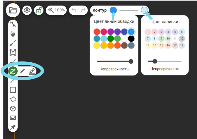 Инструменты ручка, контур и маркер находятся в одной группе. В панели текущего инструмента можно настроить цвет/прозрачность линии, толщину и тип линии, цвет/прозрачность заливки.