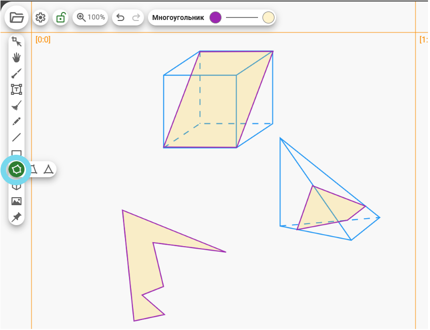 Эта группа объектов включает произвольные многоугольники, четырехугольник и треугольник. Все они строятся по точкам с помощью нажатия левой кнопки мышки в нужную точку. Для завершения многоугольника в конце нужно нажать на кнопку «Завершить» на панели текущего инструмента или на первую точку многоугольника. Четырехугольник и треугольник завершаются автоматически при нажатии заданного количества точек.