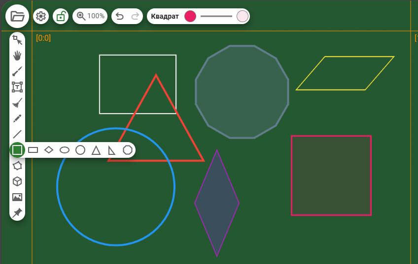 На доске Chattern такие фигуры как прямоугольник, эллипс и окружность, равнобедренный и прямоугольный тругольник и правильный многоугольники строятся в один клик. Для всех этих объектов в панели текущего инструмента можно указать цвет и тип линии и цвет заливки. Для равностороннего полигона также можно указать количество углов.